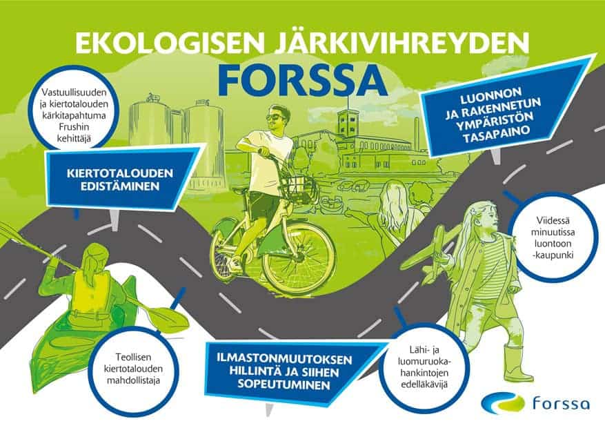 Valmiissa ekologisen järkivihreyden tiekartassa nostetaan esille Forssan kaupungille ominaisia teemoja ja uniikkeja erottautumistekijöitä. Forssa on vastuullisuuden ja kiertotalouden kärkitapahtuma Frushin kehittäjä, teollisen kiertotalouden mahdollistaja, lähi- ja luomuruokahankintojen edelläkävijä sekä kaupunki, jossa pääsee viidessä minuutissa luontoon. Nämä kaikki tekijät vievät Järkivihreä Forssa 2030 –strategiaa eteenpäin.