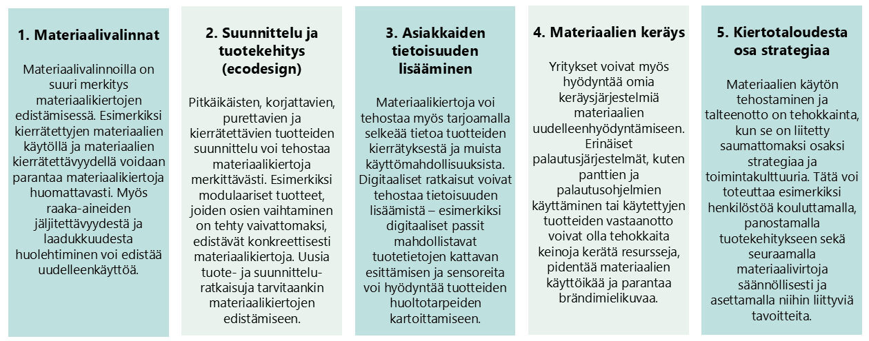 Yritykset voivat edistää tehokkaita materiaalikiertoja monin eri keinoin. Esimerkiksi materiaalivalinnat, suunnittelu, tietoisuuden lisääminen, tuotannon logistiikan parantaminen ja materiaalikiertojen nostaminen osaksi strategiaa tukevat kierrätysasteen kasvattamista koko arvoketjussa, ei vain omassa toiminnassa.