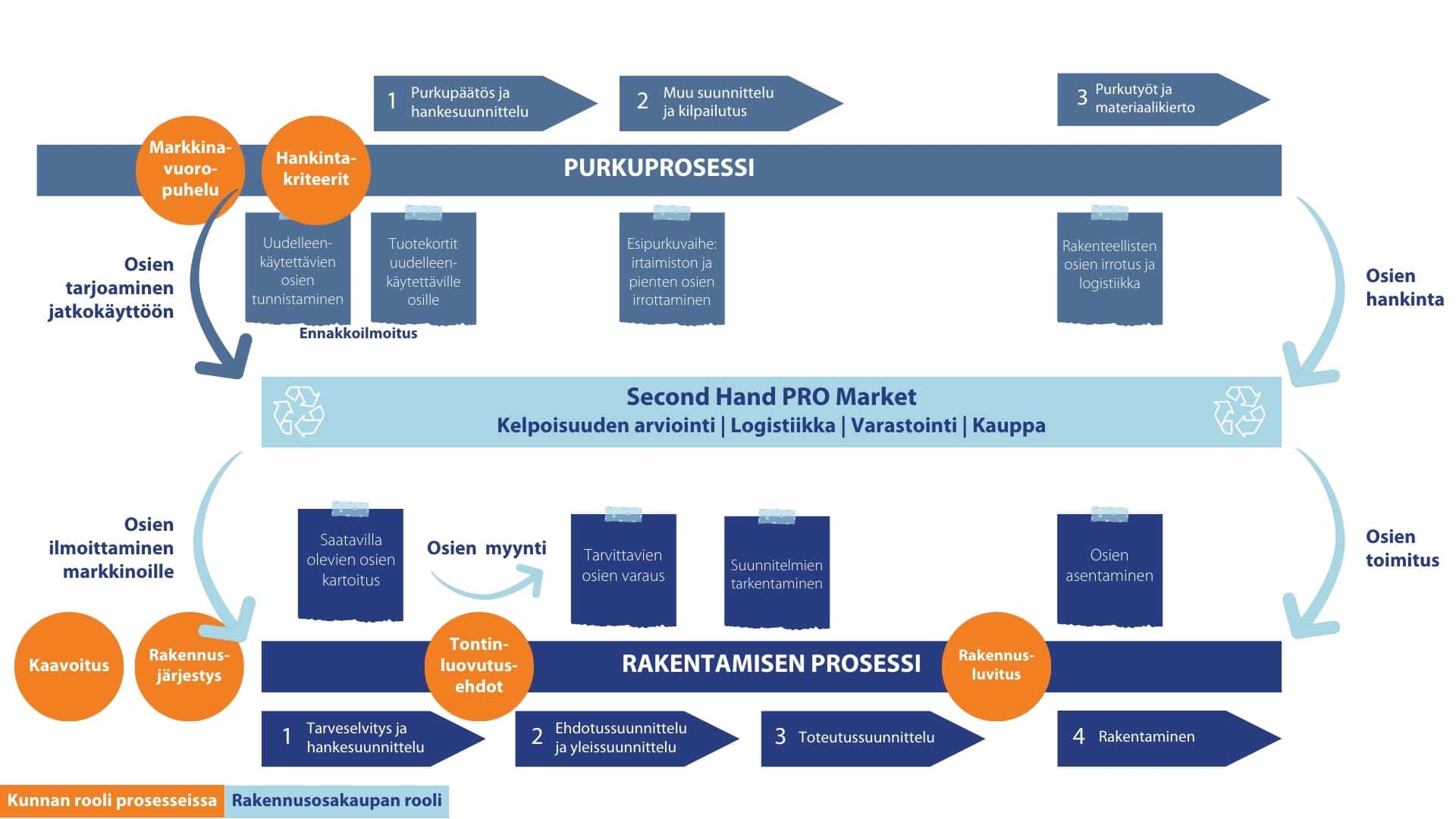 Kierivä loi osana selvitystä prosessikaavion rakennusosien laajamittaiselle hyödyntämiselle. Uudelleenkäytön edistäminen edellyttää rakentamis- ja purkuprosessien välistä tiivistä vuorovaikutusta, ja rakennusosakauppa sijoittuisi prosessien väliin.